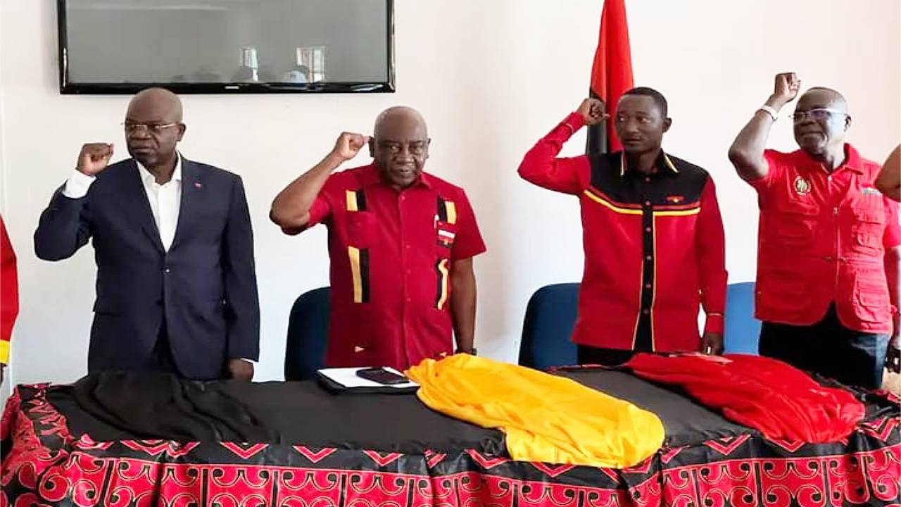 Pedro Neto, ladeado pelo director do Departamento para Organização e Inserção na Sociedade, Amaro Nguengo, e o Cônsul Geral de Angola no Rundu, destacou as principais tarefas, formas de trabalho e relações que os militantes devem ter com as autoridades locais.