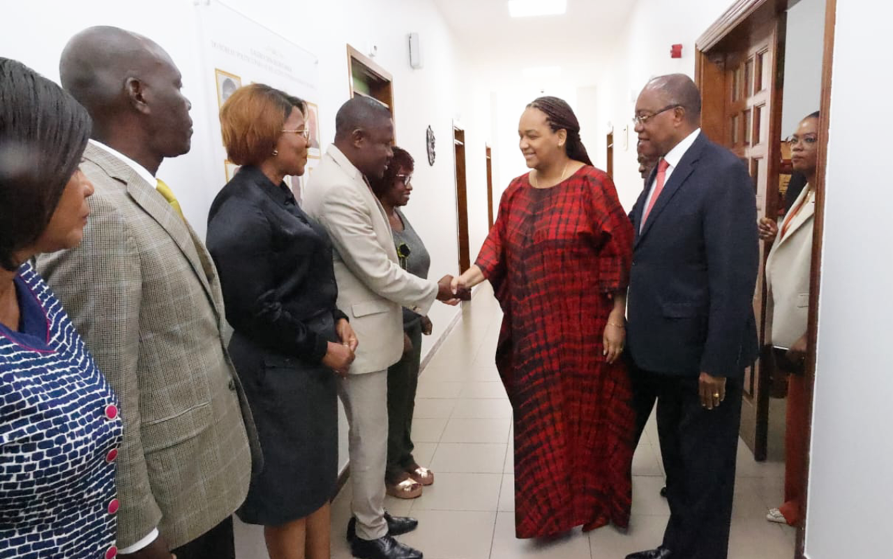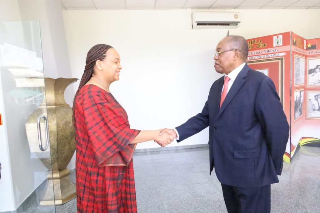 Mara Quiosa em companhia do Secretário-Geral do MPLA, Paulo Pombolo e da Secretária do Bureau Político para Administração e Finanças, Nádia Monteiro, à sua chegada recebeu saudações de boas-vindas do titular da pasta, Manuel Augusto, que fez as honras da casa.